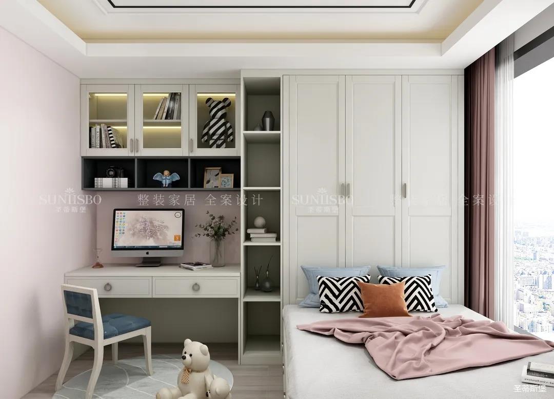 考虑到儿童身体免疫系统尚未成熟,抵抗力相对会较弱,所以空间采用了E0级全实木打造,少女粉墙体与仿古白柜体对应搭配出儿童空间的平衡点,典型的榻榻米+书桌的设计,既保证了足够的学习区,还兼顾着收纳功能。